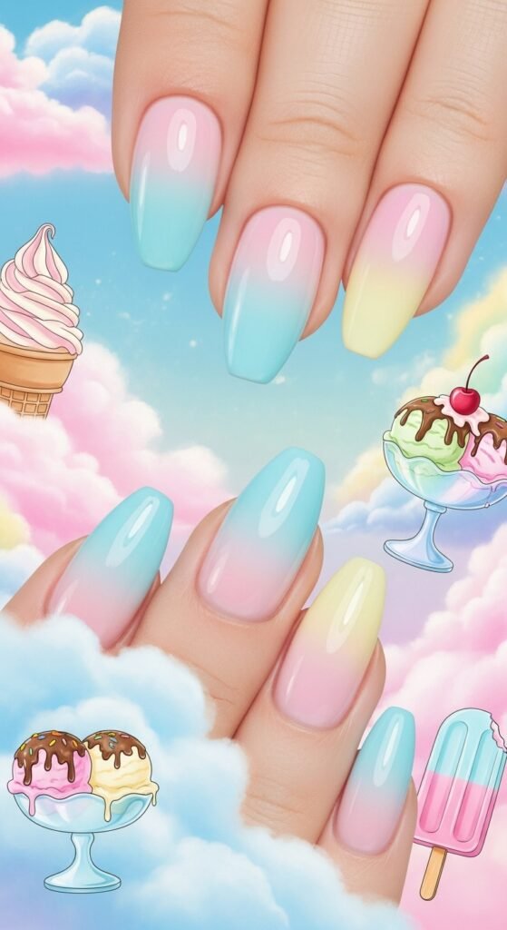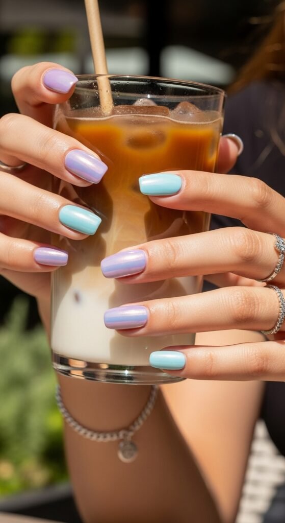 Pastels fade into each other—pink into blue, yellow into peach. It’s like cotton candy on your nails.