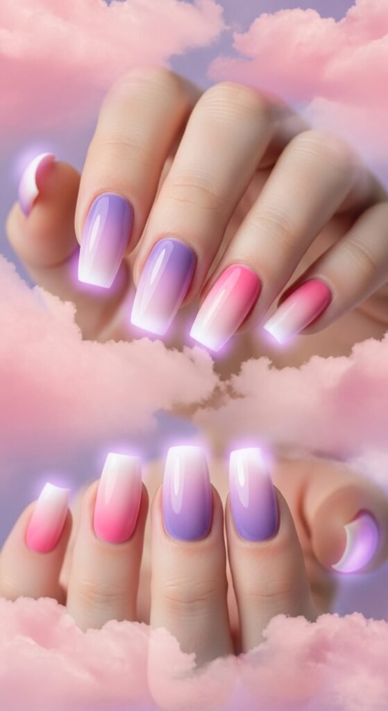 These dreamy, airbrushed nails create that “energy field” look. Imagine a soft pink center fading into purple edges.
