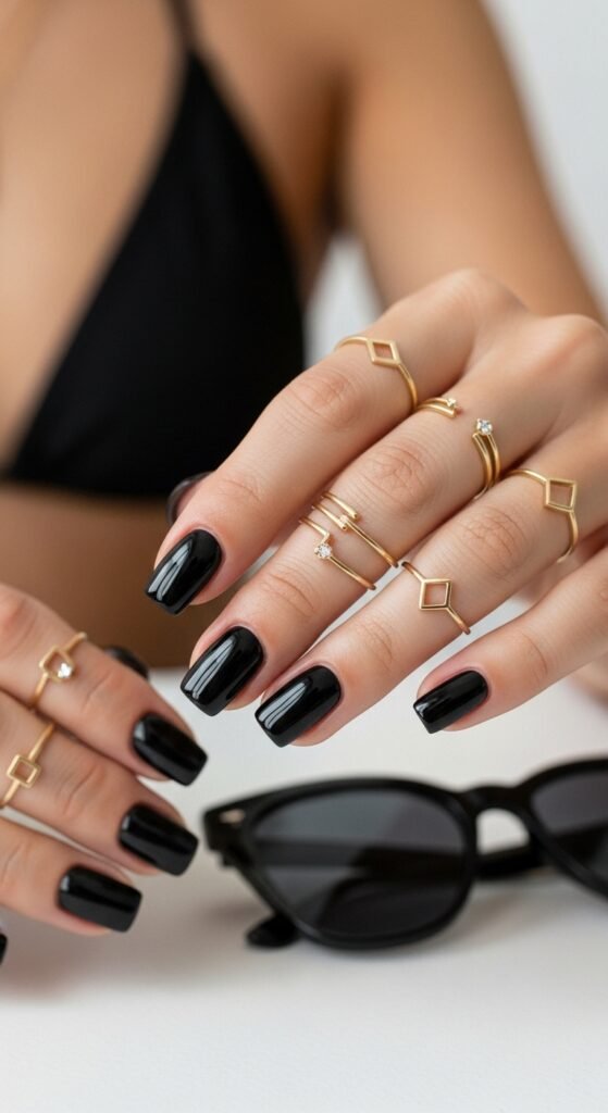 Black nails in summer? Yes, but make them glossy, short, and clean. It’s minimalist chic, not gothic.