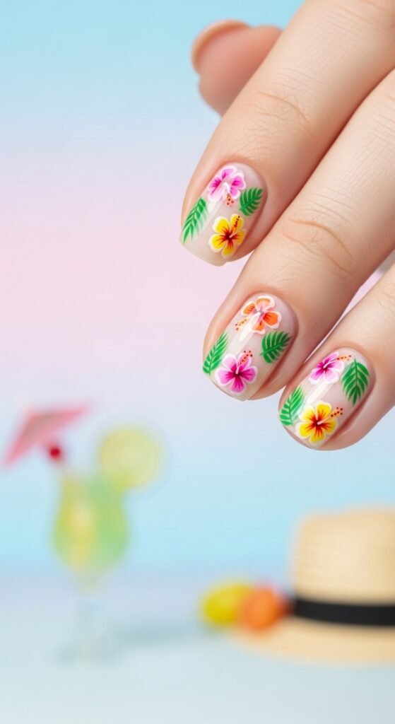 Mini hibiscus, palm leaves, or sunflowers painted on nails. It screams vacation.