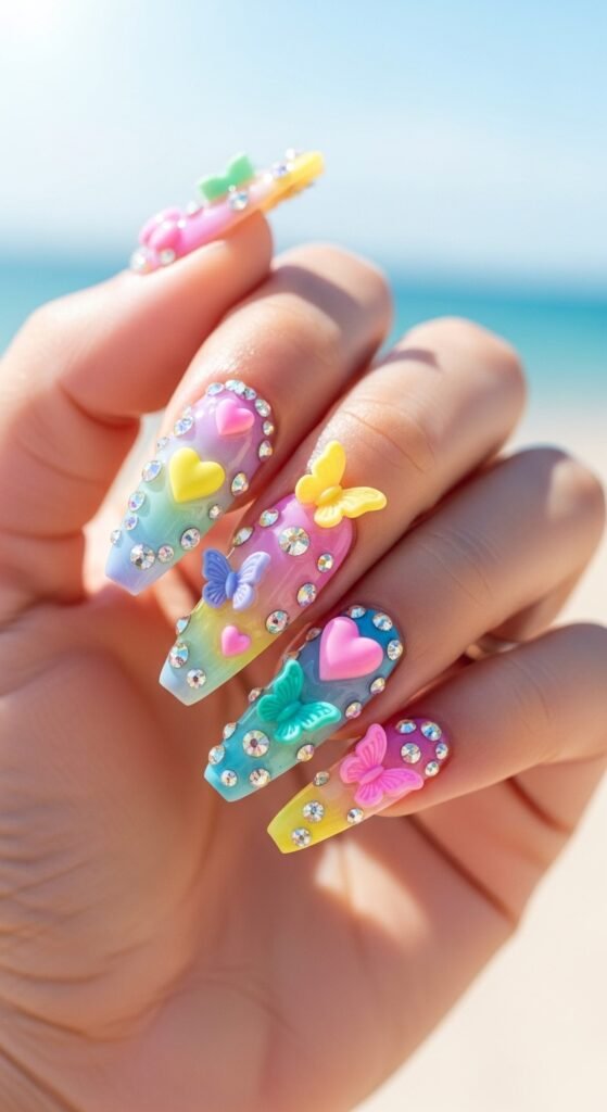 Hearts, butterflies, even little gems glued onto nails. They’re playful, not practical (good luck typing), but so fun for events.