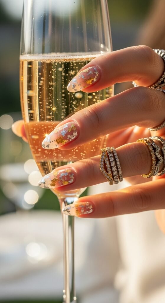 Think tiny flecks of gold or silver foil pressed onto your nails. It’s subtle but makes you look expensive.